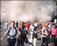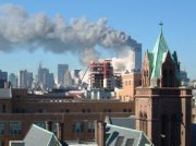 I am a tourist in Times Square looking up at the giant TV screens thinking I'm seeing a disaster movie as I watch the Twin Towers crash to the ground, and I am a New York woman sending e-mails to friends and family letting them know that I am safe. May I know peace. I am a piece of paper that was on someone's desk this morning and now I'm debris scattered by the wind across lower Manhattan, and I am a stone in the graveyard at Trinity Church covered with soot from the buildings that once stood proudly above me, d! death meeting death. May I rest in peace.
